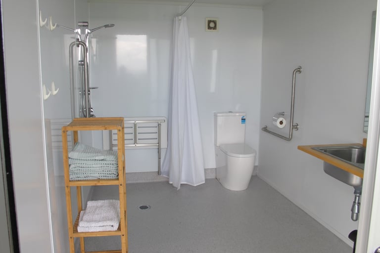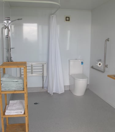 The large bathroom cabin is between the two accommodation cabins and has a wheelchair access shower, toilet and basin. Towels etc are supplied.