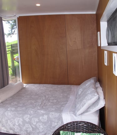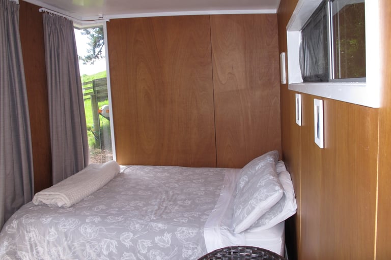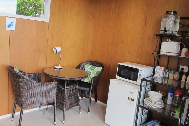 Kauri cabin comes with a queen bed, seating, plus fridge. There is a toaster, microwave, kettle and a small gas BBQ.